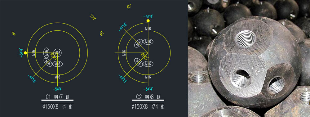 ①、 下弦桿與球的組裝: 根據安裝圖的編號,墊好墊實下弦球的平面,把下弦桿件與球連接并一次擰緊到位。